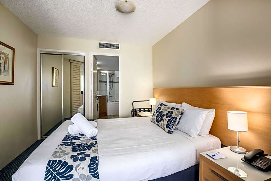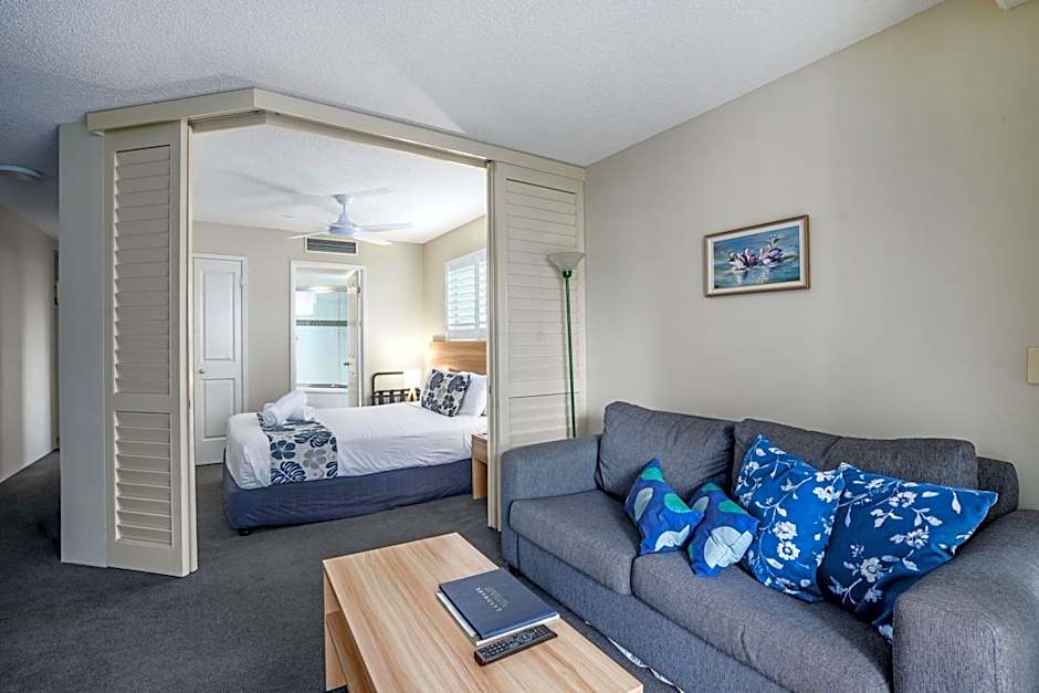 1 Bedroom Apartments are located on Level 2 on the southern side of the building offering partial to limited ocean views. The apartments offer a separate bedroom with a queen size bed, a lounge/dining room, full kitchen & laundry facilities and a step-up spa bath with overhead shower.